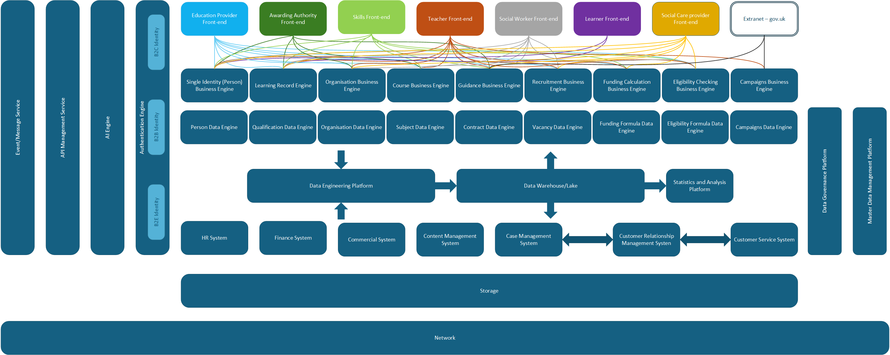 The target architecture supports the goals described in DfE’s digital, data and technology strategies and aligns with our architecture principles. It has full support from the Chief Digital and Technology Officer (CDTO) and DDT Committee.